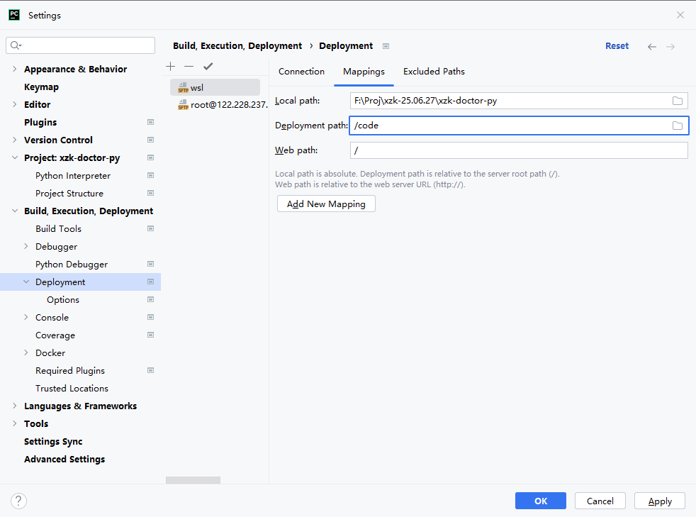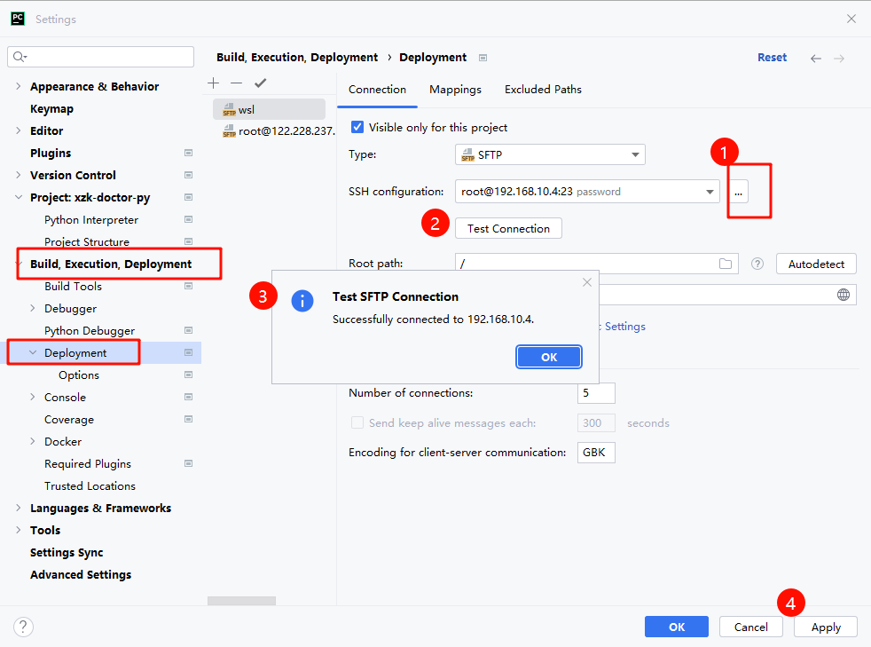 1、settings>build,execution,deployment>添加 sftp 连接,配置 ssh 连接,最后 apply